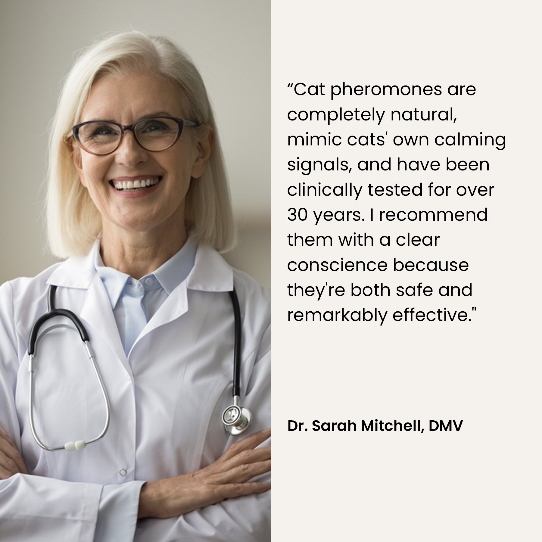 "In my 15 years as a veterinarian, I've had consistently great experiences with cat pheromones. They're completely natural, mimic cats' own calming signals, and have been clinically tested for over 30 years. I recommend them with a clear conscience because they're both safe and remarkably effective."